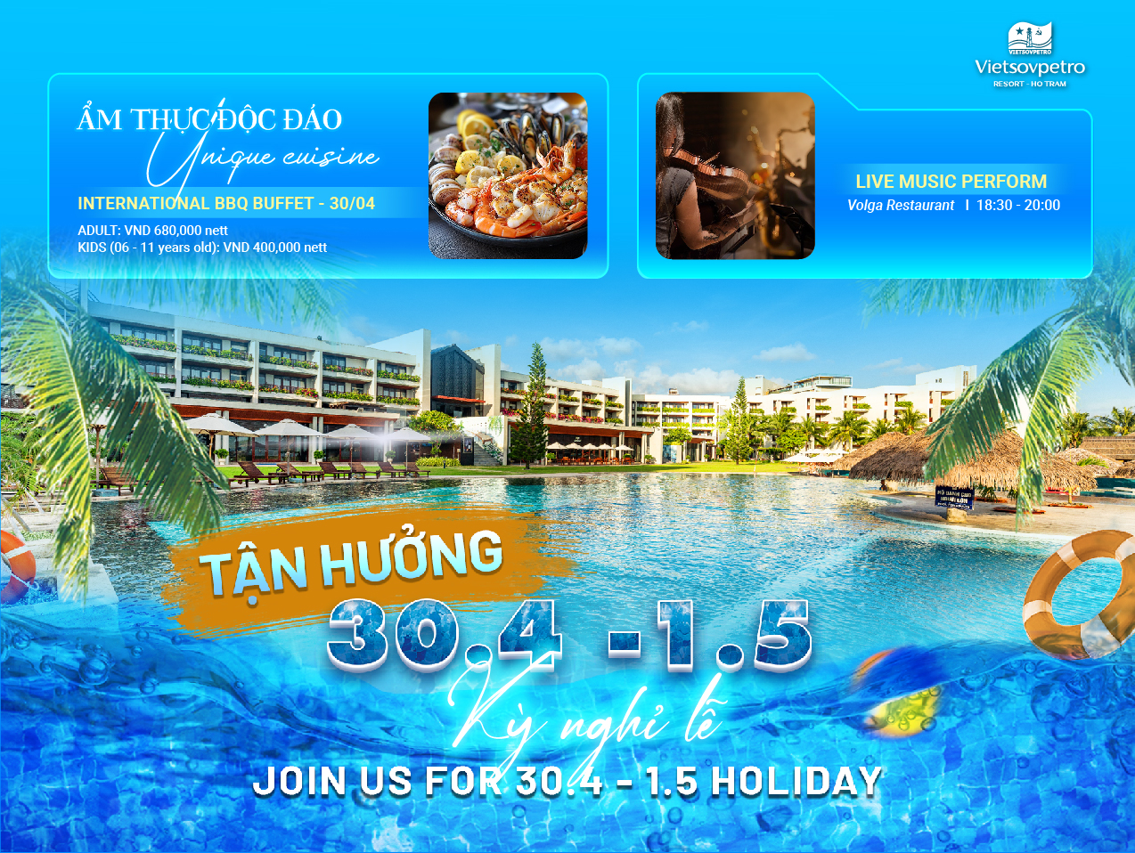 Bạn đã sẵn sàng cho kì nghỉ Lễ 30-04 & 01-05 bên gia đình và người thân yêu. Kỳ nghỉ Lễ dài ngày đầu tiên bắt đầu của mùa hè, cơ hội tuyệt vời để cùng tận hưởng biển xanh, nghỉ ngơi và thưởng thức những món ăn ngon tuyệt.