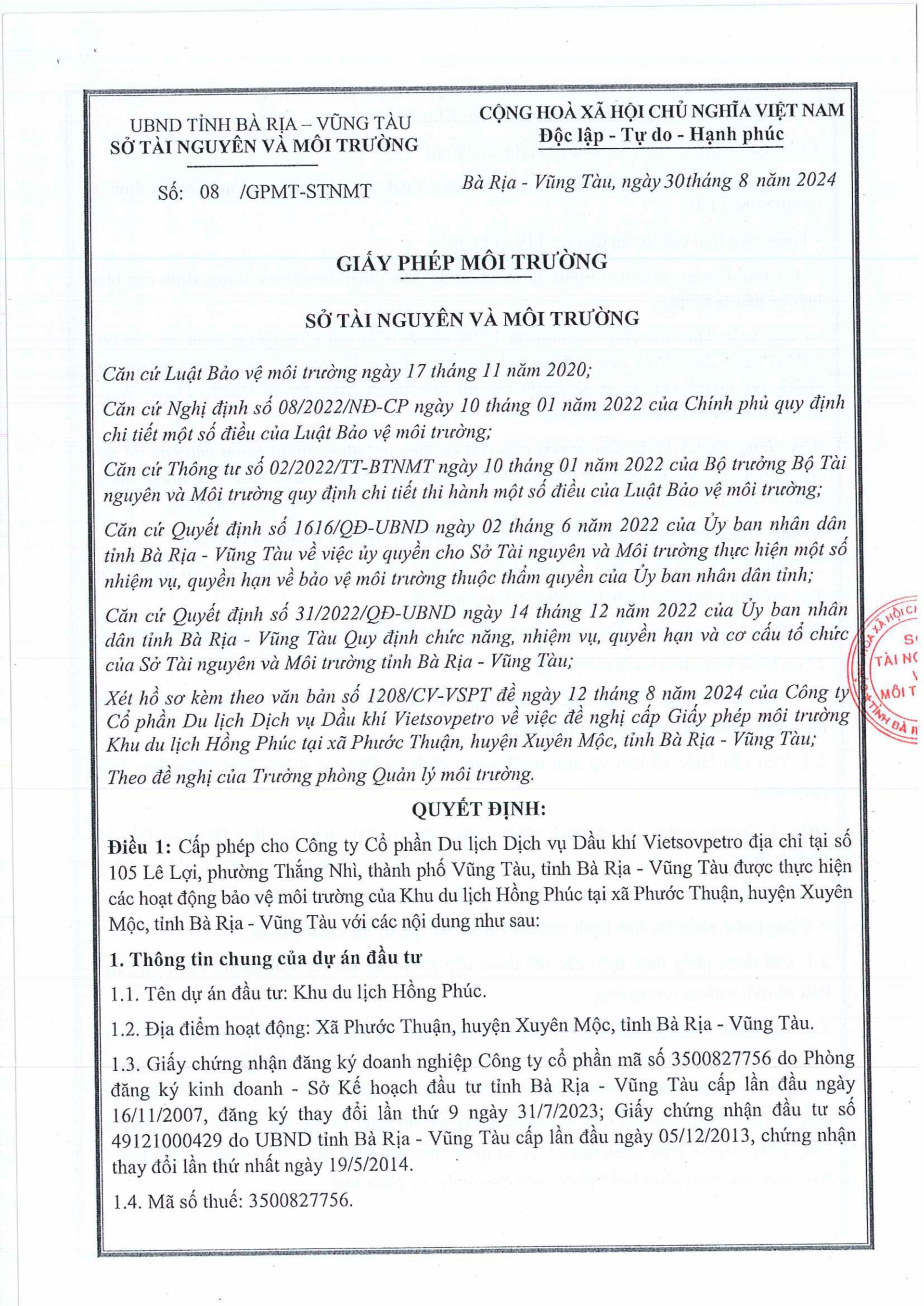 Khu du lịch Hồng Phúc - Công ty cổ phần du lịch dầu khí Vietsovpetro (Khu nghỉ dưỡng Vietsovpetro) đã được Sở tài nguyên và môi trường tỉnh BR-VT cấp Giấy phép môi trường ngày 30/8/2024.